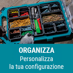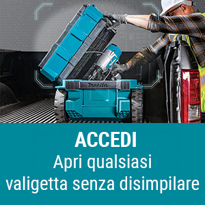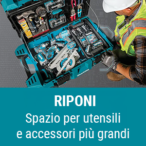 Makita MAKTRAK™ è la soluzione di stoccaggio modulare di nuova generazione per trasportare, accedere, riporre e organizzare utensili, accessori e attrezzature da cantiere. L'esclusivo sistema Trak Mount Lid di MAKTRAK, con sgancio a scatto con una sola mano, consente un facile impilamento da entrambe le direzioni. I fermi di bloccaggio, combinati con l'integrazione del coperchio e della valigetta, garantiscono un'eccellente tenuta contro gli agenti atmosferici.