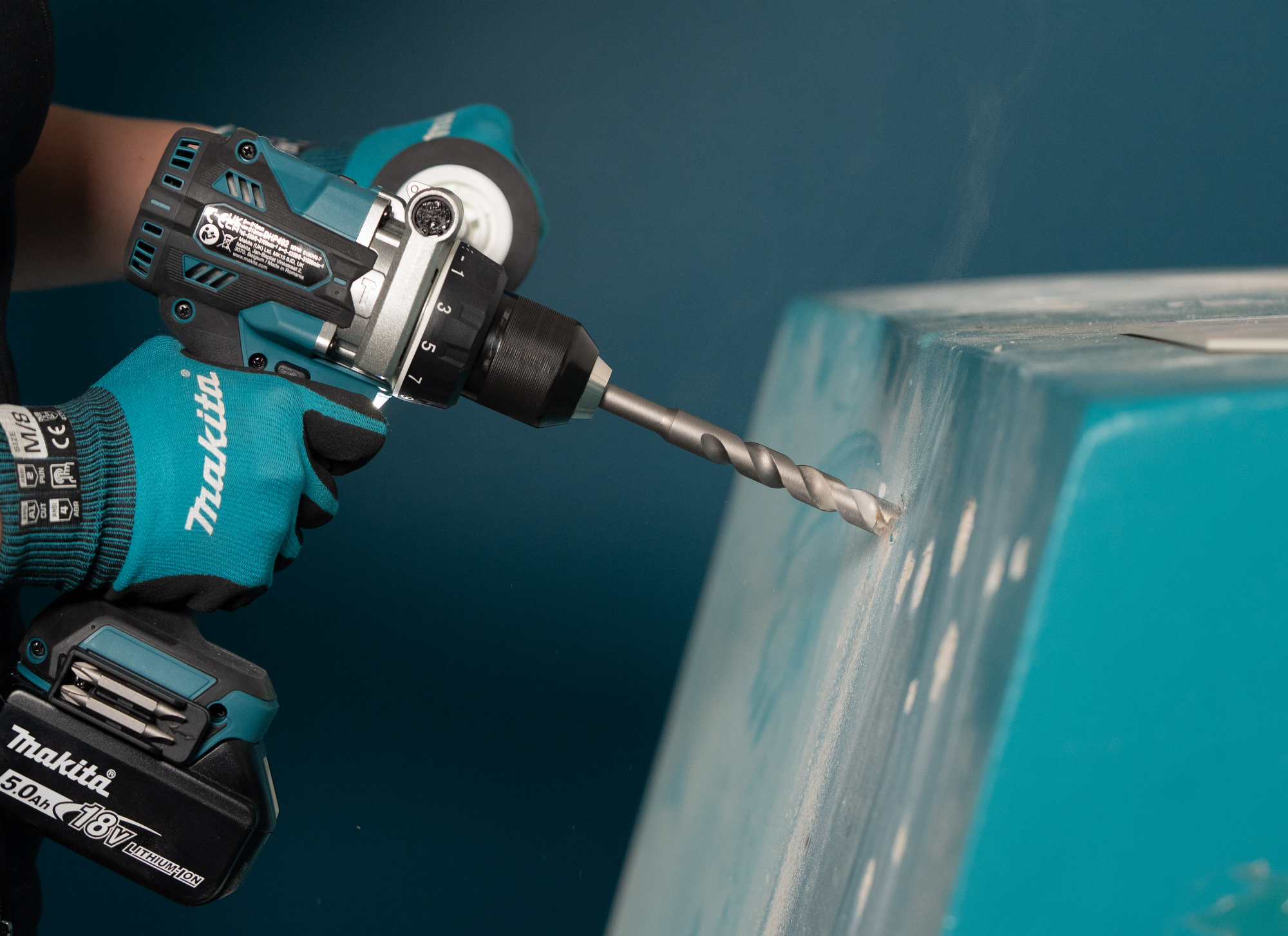 Trapano avvitatore con percussione 18V con motore brushless e una potente coppia massima di 141 Nm. Dotato di un robusto cambio a due velocità interamente in metallo, 21 impostazioni di coppia, sistema XPT® per la protezione da polvere e acqua, mandrino autoserrante in metallo da 1,5–13 mm, doppie luci a LED per una migliore visibilità. Viene fornito con impugnatura laterale e clip da cintura per maggiore sicurezza e praticità. 3 batterie da 5,0 Ah, un caricabatterie e valigetta MAKPAC inclusi.