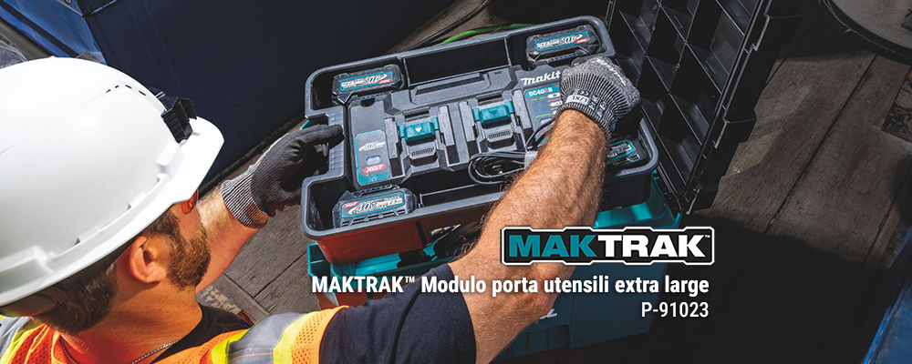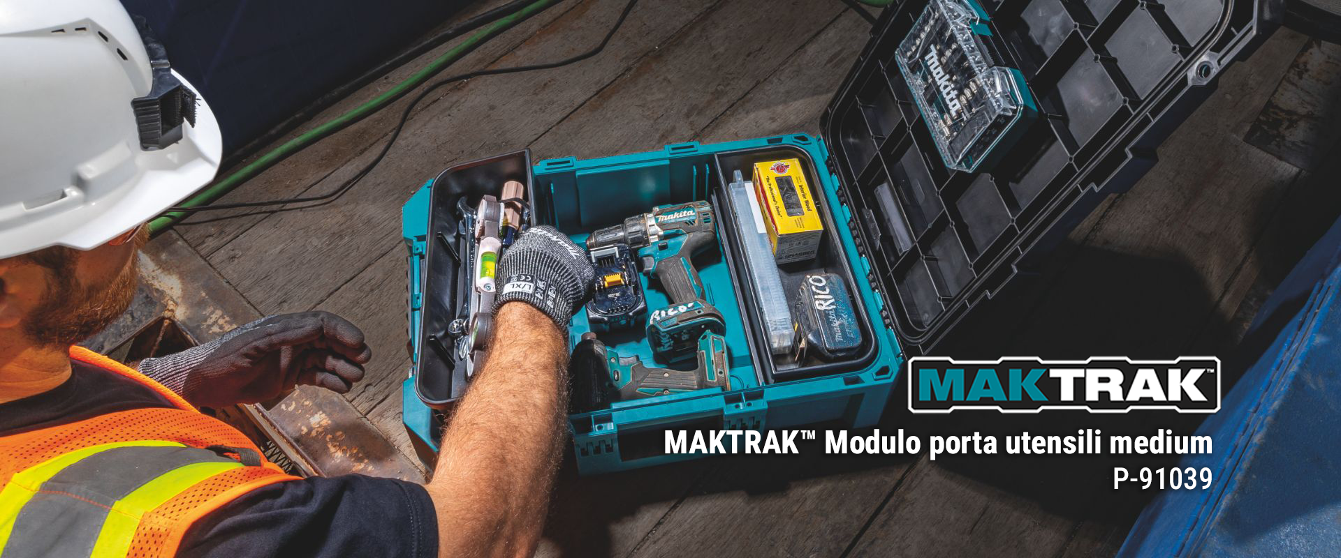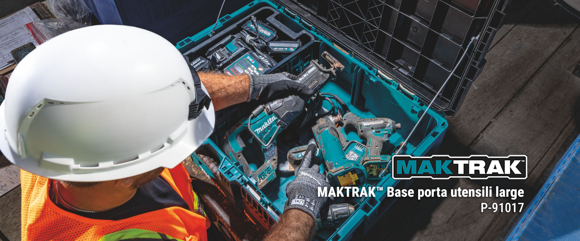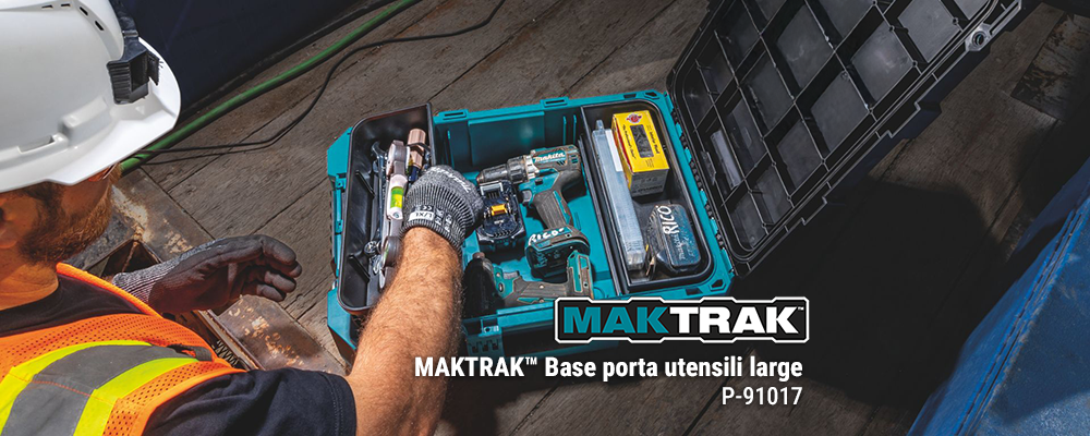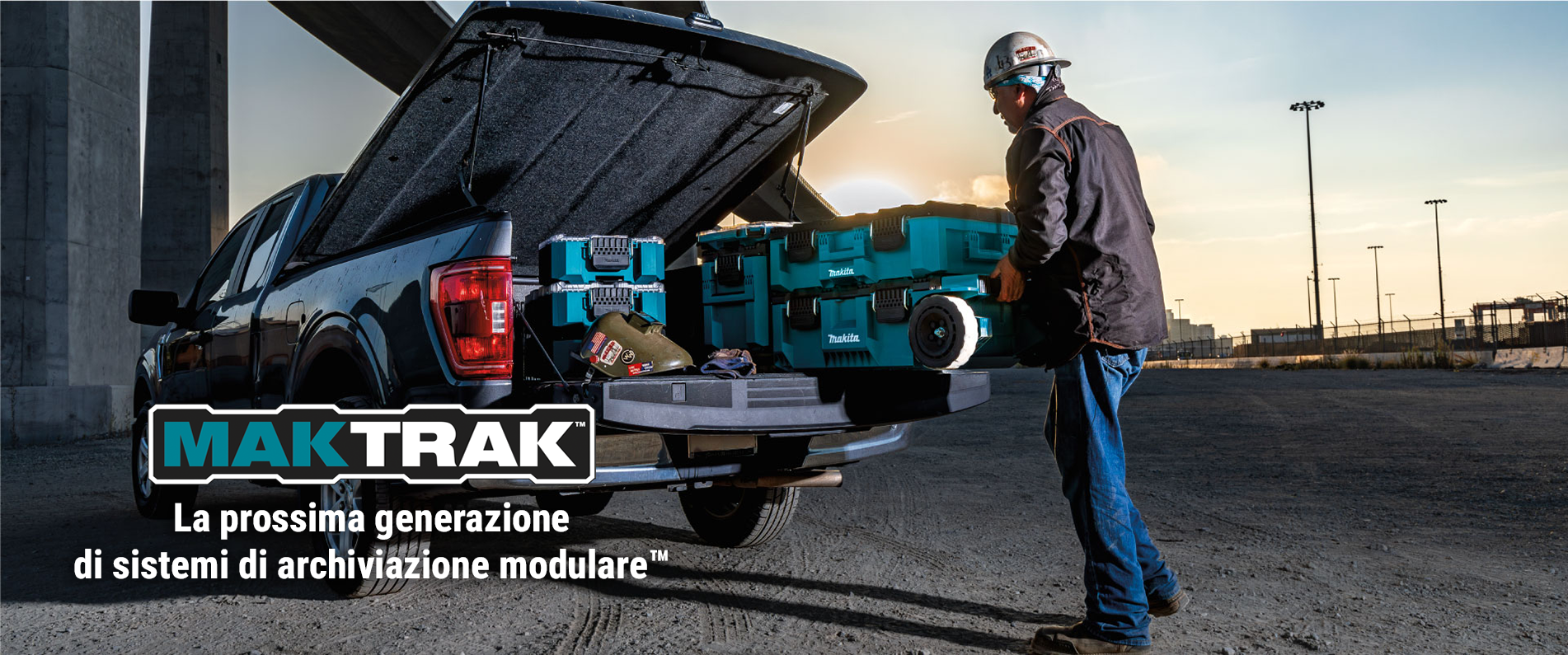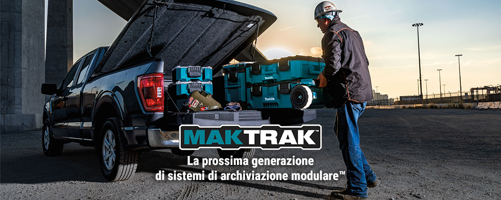 Makita MAKTRAK™ è la soluzione di stoccaggio modulare di nuova generazione per trasportare, accedere, riporre e organizzare utensili, accessori e attrezzature da cantiere. L'esclusivo sistema Trak Mount Lid di MAKTRAK, con sgancio a scatto con una sola mano, consente un facile impilamento da entrambe le direzioni. I fermi di bloccaggio, combinati con l'integrazione del coperchio e della valigetta, garantiscono un'eccellente tenuta contro gli agenti atmosferici.
