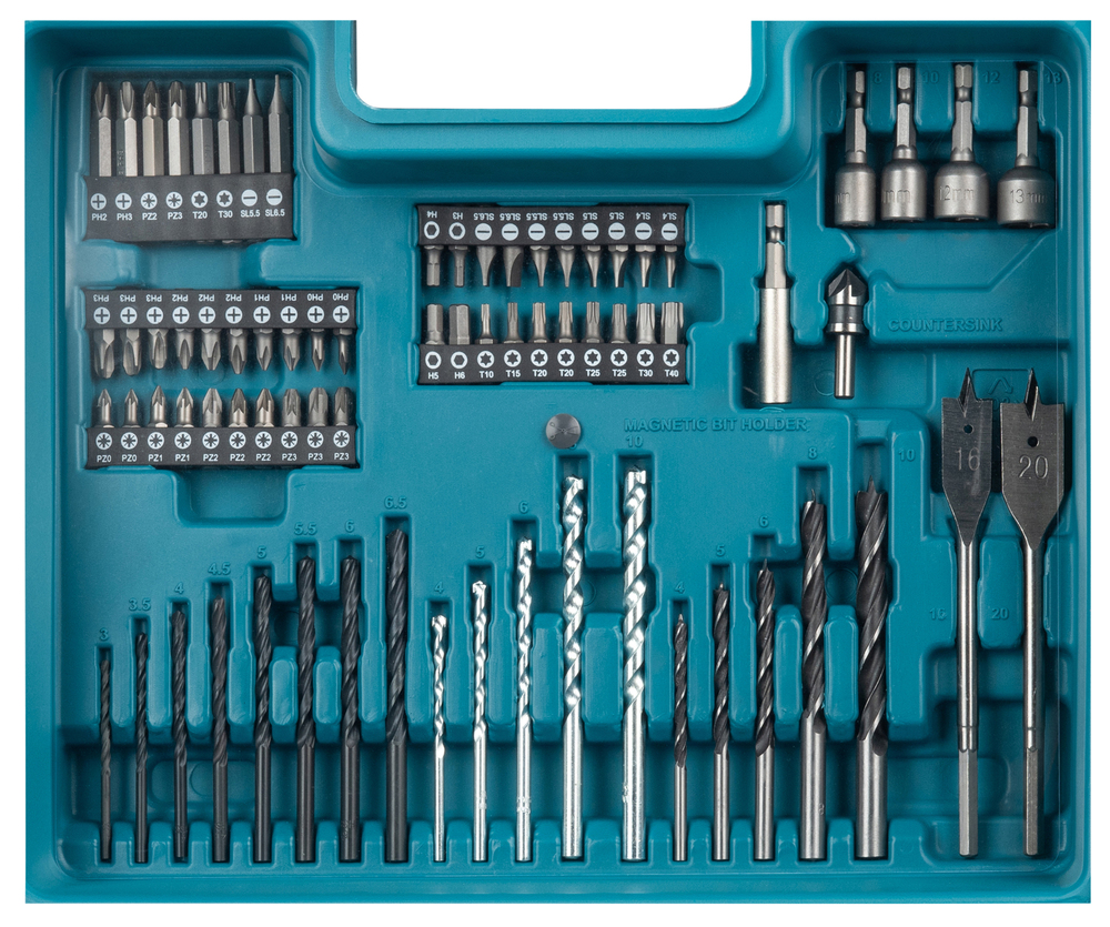 Set per avvitatura e foratura per metallo e legno. Il set è composto da 8 punte per trapano HSS-R per metallo, 5 punte per trapano TCT per metallo, 2 punte piatte per legno, 5 punte da trapano autocentranti per forare il legno, 4 bussole magnetiche con attacco rapido ¼” E-Form per dadi, 48 inserti per avvitatura, 1 svasatore 1 portainserti.