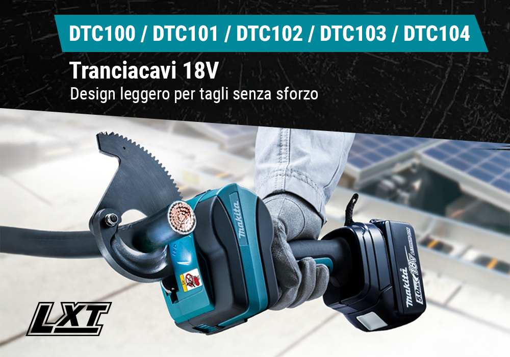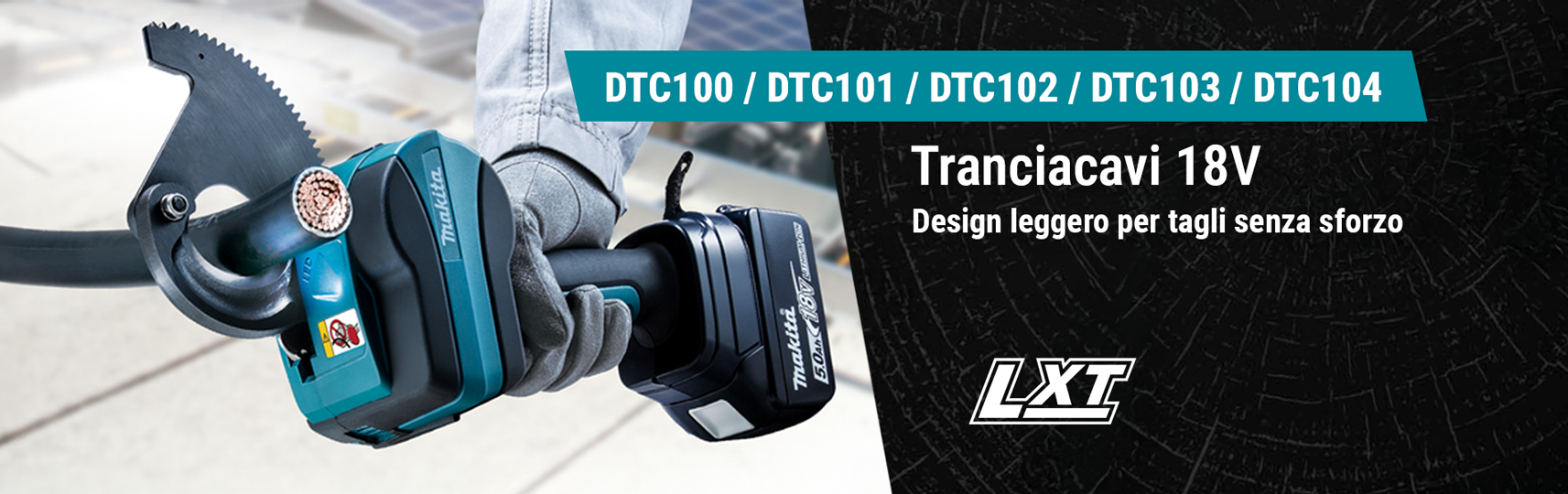 Il tranciacavi a batteria 18V LXT (modelli DTC100–DTC101-DTC102-DTC103) è progettato per attività di taglio rapide e precise: offre un’eccellente manovrabilità, il suo design leggero consente agli utenti di tagliare cavi in alluminio e rame senza sforzo nella posizione desiderata. Il modello DTC103 è specificatamente indicato per il taglio di cavi ACSR (alluminio rinforzato con acciaio). Il tranciacavi, inoltre, è dotato di fori metallici per il fissaggio di una tracolla opzionale (codice articolo 161347-8) per maggiore praticità e portabilità.